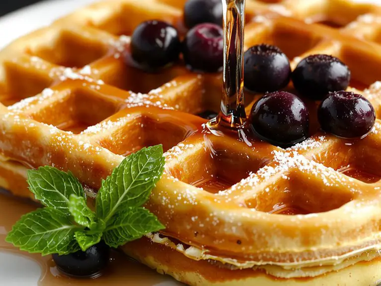 Creating the perfect Belgian waffle isn’t just about the ingredients; it’s about technique. Preheat your waffle iron thoroughly to guarantee even cooking. Don’t overmix the batter—it should be slightly lumpy.