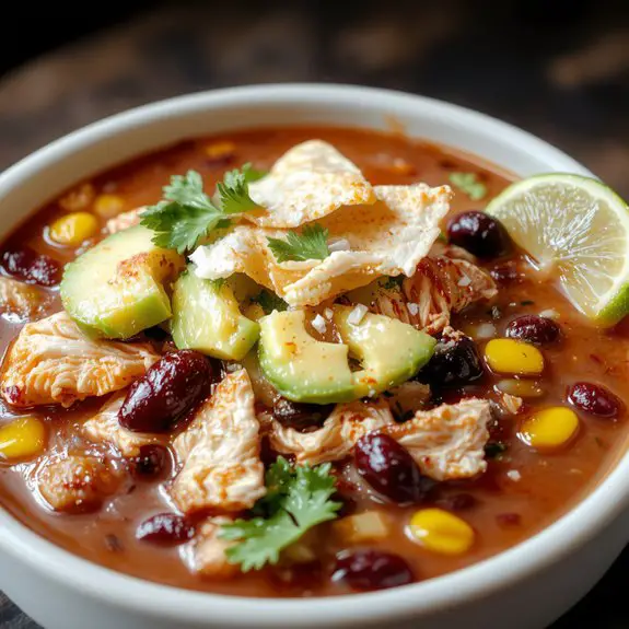Imagine this: tender chicken simmered in a smoky, slightly spicy broth, loaded with juicy tomatoes, sweet corn, and creamy beans, then topped with crispy tortilla strips, fresh avocado, and a zesty squeeze of lime.