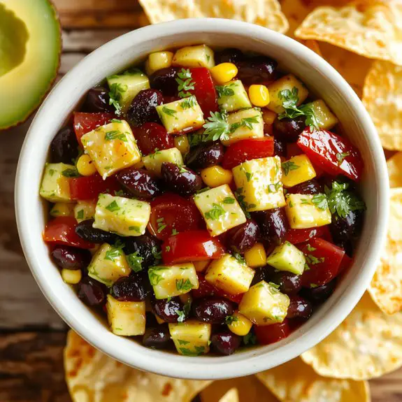 When I make cowboy caviar, I always chop the veggies uniformly to guarantee every bite’s balanced. I use fresh lime juice for brightness and adjust the seasoning gradually to avoid overpowering the flavors.