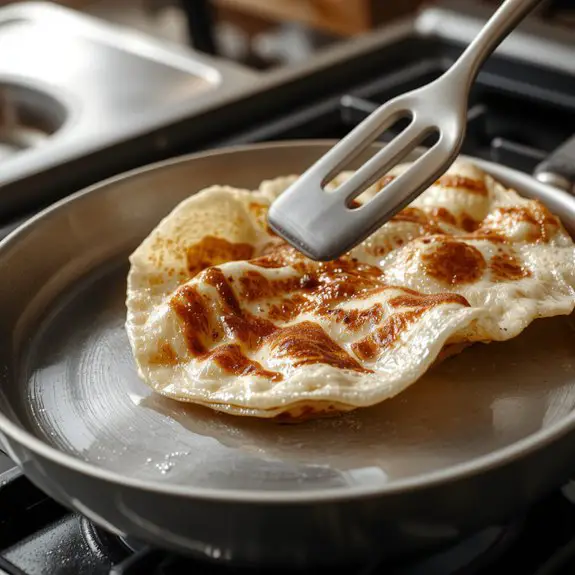 • Cook for 1-2 minutes until the edges lift slightly and the bottom is golden brown. Avoid flipping too early; the crepe should release easily from the pan when ready.