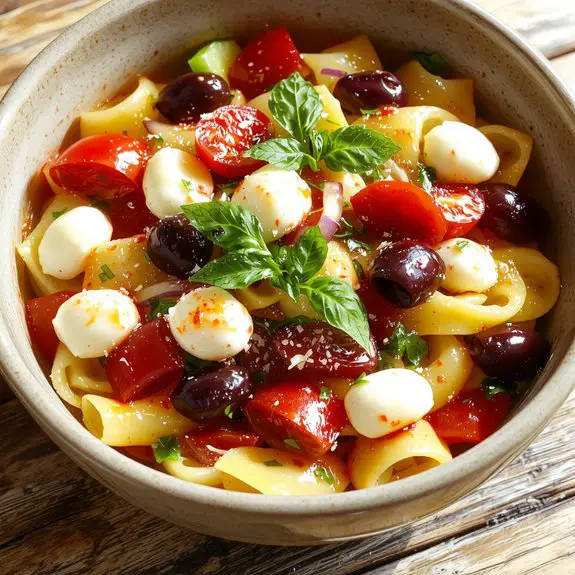 Add olives, fresh mozzarella pearls, and basil leaves for an authentic Italian touch. Pro tip: Gently fold in delicate ingredients to avoid crushing them.